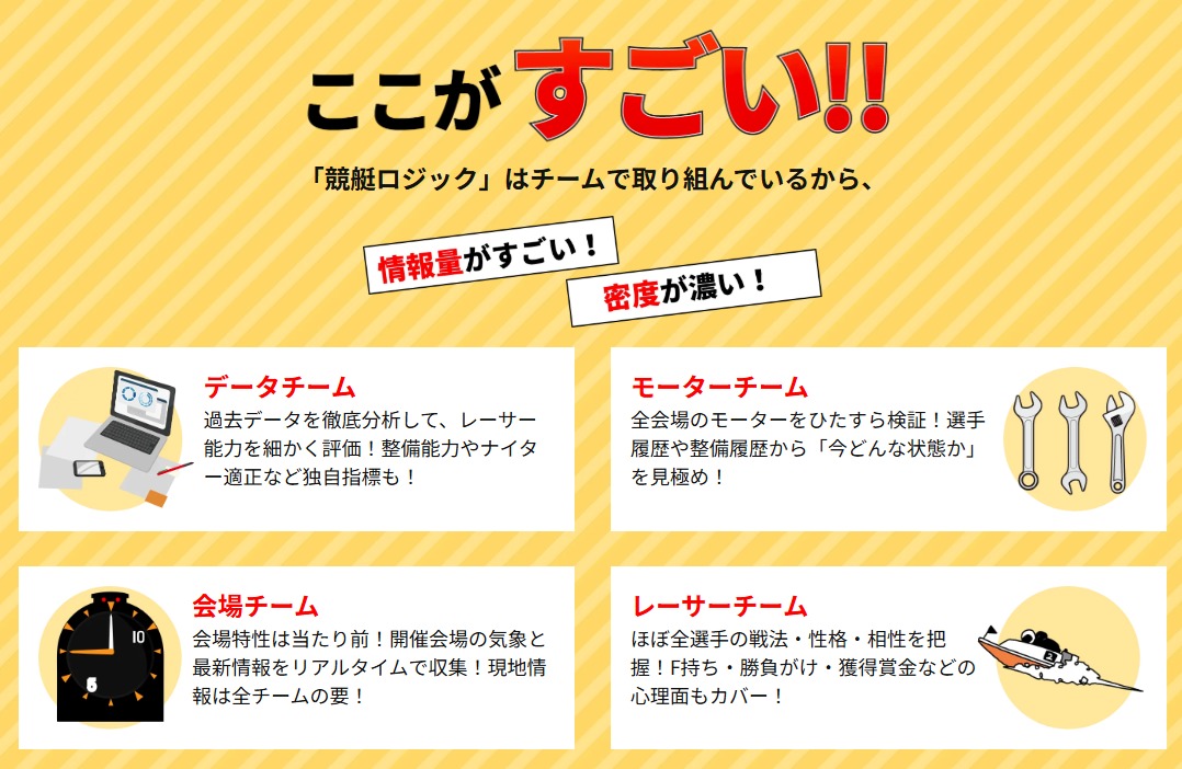 しかしどれだけ的中をしてもその中身が問われないためトリガミや点数が多く買っても買っても損をしているとすればどうでしょうか? 的中率が50%でも回収率が50%であれば堅いレースを絞りきれないくらい舟券を購入している、少しでも波乱が出るとそれをまったく対応出来ないといった課題がそこからは簡単に露呈してきます。 つまり儲けるという観点で見た時に「的中率がどれだけ良いか」というのは評価の基準としては参考にならず「どれだけ回収率が良いか」という部分を重視する必要があります。 全てのギャンブルにおいて勝ちたいという人はまずこの回収率が上がる方法を模索していきましょう。 回収率が良い競艇予想サイトを参考にするというのも最適な案の1つとして候補に取り入れるのも良い方法でしょう。 無料⇒150%~500% 有料⇒400%~1000% 無料予想は的中した際に投資金額の1.5倍から5倍の払い戻し、有料情報は投資金額の4倍から10倍の払い戻しがそれぞれ期待できるという計算になります。 ここで大事なのが「どれだけ優秀な競艇予想サイトでも100%は的中できない」という点についてです。 しかし回収率が高い予想サイトというのは中長期的に利用することで外れた分を取り戻す事が出来るので「3回に1回当てれば良い」、「4回に1回当てれば儲かる」といった1つの基準が利用しているサイトごとに生まれてくることこそが利用目安を見極めるテクニックとなります。 なお負けと勝ちを繰り返して最後にトータル成績で見たときにプラス(回収率101%以上)へと導いてくれた実績があるサイトを私は優良サイトとして皆様に紹介しているので当サイトで推奨しているサイトを利用することも勝てる方法の1つの手段に近づける方法となります。 1回利用して当たらないから「詐欺、騙された」ではなく「何回か利用していくことでその良さが見えてくる」ことを常に忘れずにまずは無料予想から競艇予想サイトの利用をスタートしてみましょう。 競艇予想サイトは年々進化し、AI分析を活用したものや独自の情報網を駆使したものなど、様々なタイプが登場しています。 当サイトでは、以下の項目を基準に安心して利用できる優良競艇予想サイトを常に厳選更新中! どのサイトを使うべきか迷っている方は、ぜひこのランキングを参考にしてみてください! (更新日:2026年1月9日) ★★★★★ 4.9点 利用者の口コミでも「堅実に狙える」「資金管理がしやすい」といった意見が目立ち、競艇予想サイトを初めて利用する方でも取り入れやすいサービスとして支持されています。 ★★★★★ 4.8点 競艇予想サイト「競艇ロジック」は、買い目の根拠、分析体制、使いやすさが評価されており、特に初心者〜中級者に向いた選択肢としておすすめです ★★★★★ 4.8点 🎁 LINE登録で最大1万円分のポイントプレゼント! 🎁 充実のサポート体制で初心者でも簡単に利用が可能。 ★★★★★ 4.9点 実際の利用者からは「無理なく当てられる」「資金の運用が計画的にできる」といった声が多く寄せられており、初めての方にも安心して活用いただける予想サービスです。 ★★★★★ 4.5点 ✅ベテランスタッフが、現地でしか得られない情報を提供 その最大のメリットは通常のルートでは手に入れる事が出来ない情報を基にした買い目で多くの儲けを生み出す事が出来ます。 しかし、全ての予想サイトが利用者の味方ではありません。 予想サイトによっては素人同然の人間が詐欺レベルの予想や情報を高額な金額で販売しているケースがあります。 そのような予想サイトの見極めは実際に登録、利用をしたり、口コミサイト、SNSでの利用者の声をしっかりと分析することが大事となります。 新しく見つけた情報サイトを闇雲に使い騙され続けるのだけは絶対に避けましょう。 「本当に儲かるのであれば人には言うわけがない」 この考え方については理解できる部分は確かにありますが、実際の答えはNO!です。 情報商材を販売する業者はしっかりと利益を出せる実績と経験の知識と情報を共有したいという思いからくる善意なのです。 しかも多少の人に情報を共有したからといって利益の取り分に影響が出ない様な情報だからこそ共有できる裏があります。 ただし、無料で当たり前に公開できないような貴重な情報だからこそ利用者に一定の対価が必要となります。 情報がなんでも簡単に手に入る時代ですが、現在でも本当の情報にはどの業界も一定の資金が必要となり、そういう情報を手に入れている人こそが真の情報強者であり勝ち組になることが出来ます。 「本当に儲かるのであれば人には言うわけがない」 という言葉を簡単に発する人たちは、自分たちがむしろ「情報弱者に位置している」ことに危機感を感じるべきです。 それが的中したときに「ありがとう」、「感謝しています」と言われると嬉しく感じるものだろう。 つまり競艇予想サイトの人間と言うのはこの承認欲求の塊ということなのです。 しかも上述で説明したと