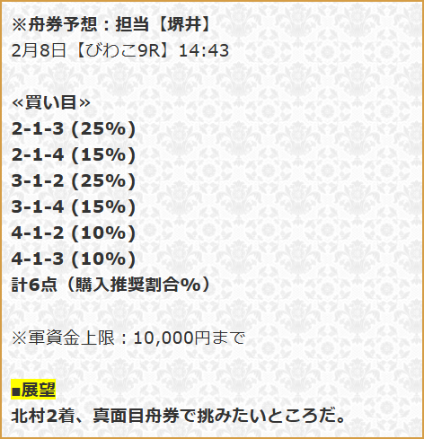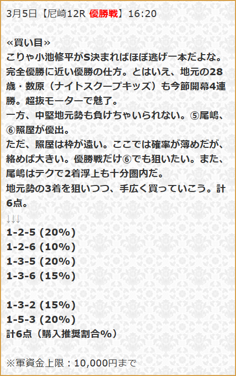 上位レーサーや実力を考慮したらしいこの予想では1号艇の平岡選手、3号艇の岡村選手、5号艇の澤選手を買い目に取り上げている。ただ気になる点はなぜか2号艇のA1レーサー村上選手を完全に軽視しているという点。