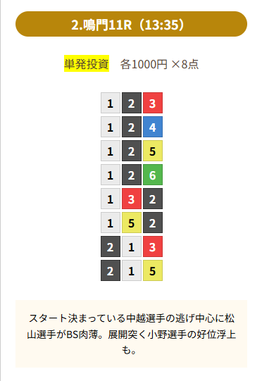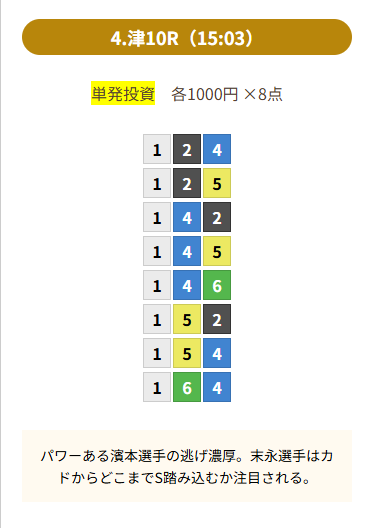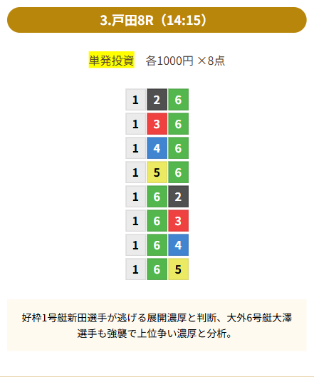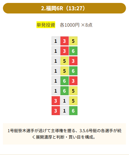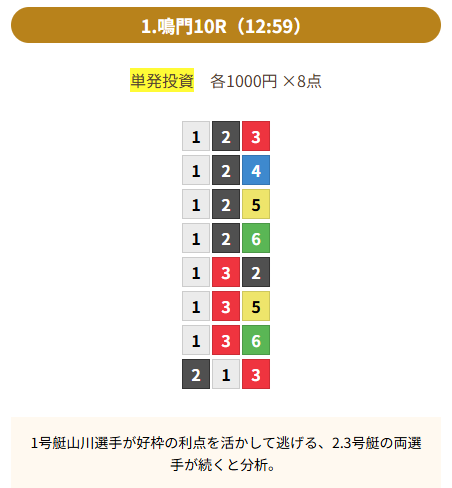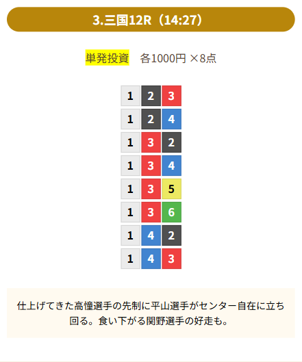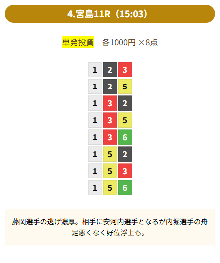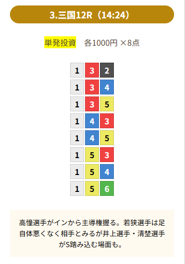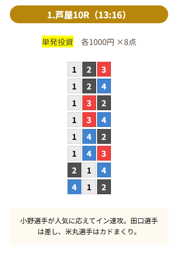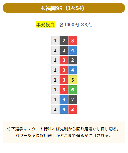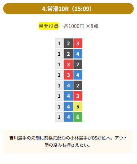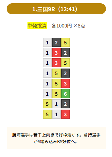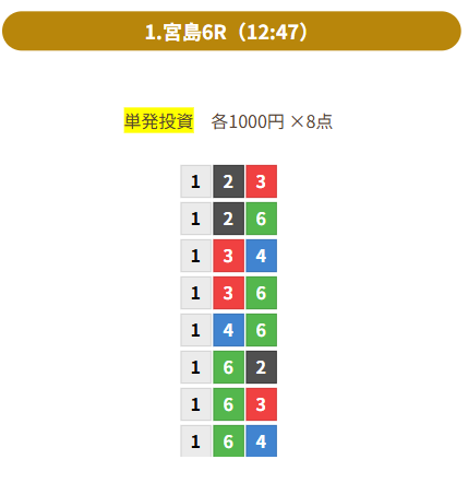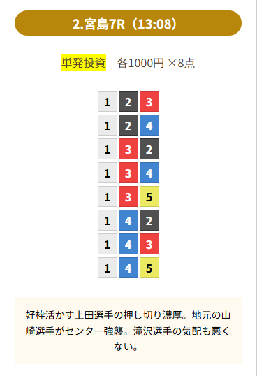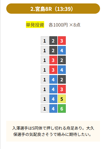 | 買い目 | 8点(3連単) |