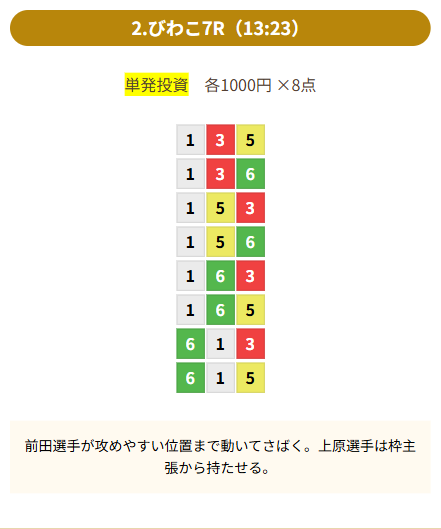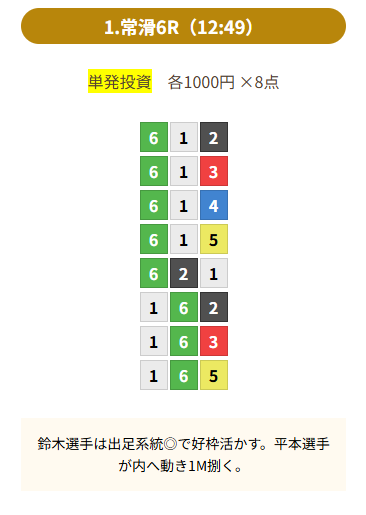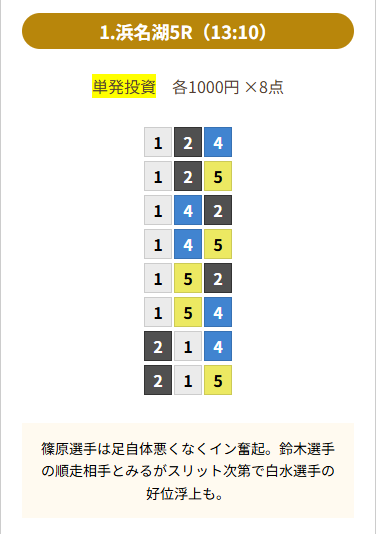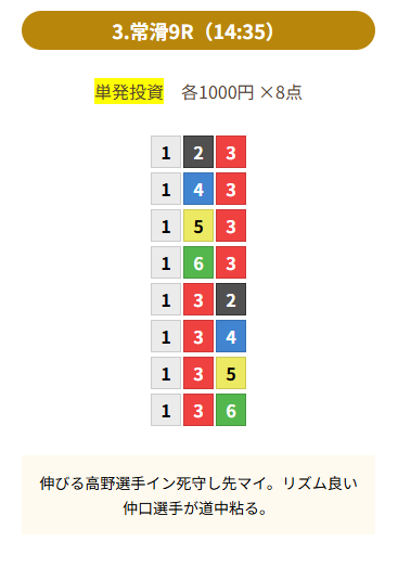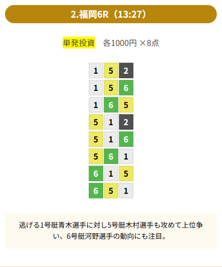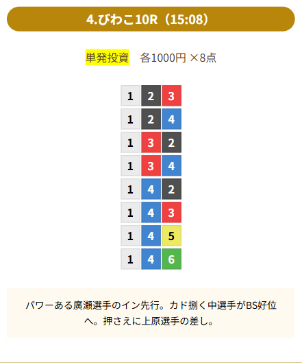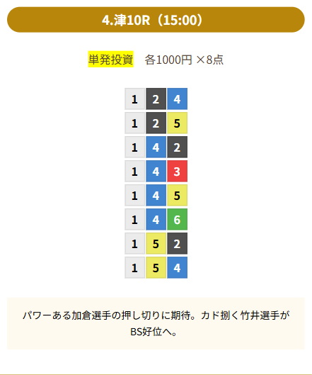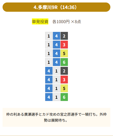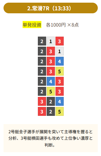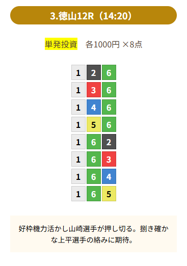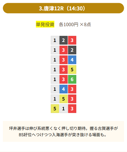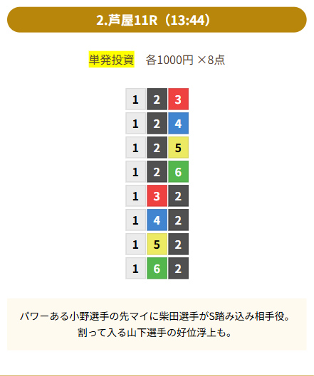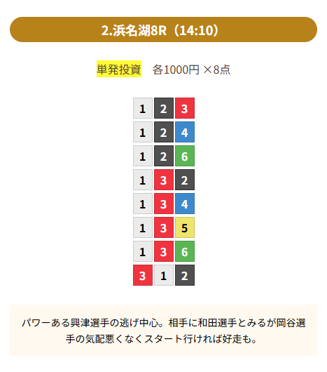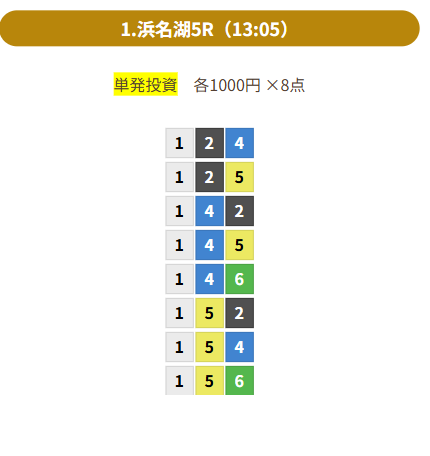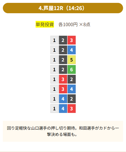 | 買い目 | 8点(3連単) |
