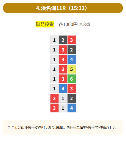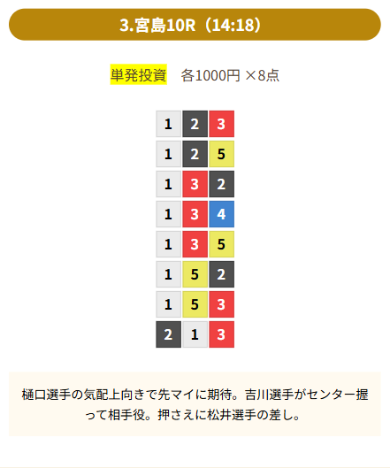 | 登録時にもらったポイントで初回の有料情報に参加。尼崎9R【1-6-2】、23.8倍で3連単を1点あたり1,000円ずつ賭けて23,800円を回収できました。 持ち出し0円でこの結果は素直に嬉しいです。予想もロジカルで納得感があり、次のプランにも期待しています。 | |
