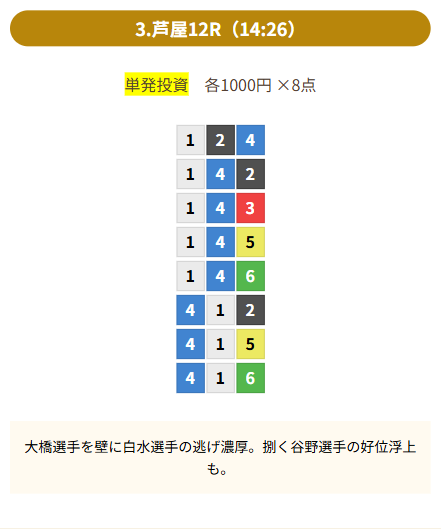 | 登録時にもらったポイントで初回の有料情報に参加。尼崎9R【1-6-2】、23.8倍で3連単を1点あたり1,000円ずつ賭けて23,800円を回収できました。 持ち出し0円でこの結果は素直に嬉しいです。予想もロジカルで納得感があり、次のプランにも期待しています。 | |