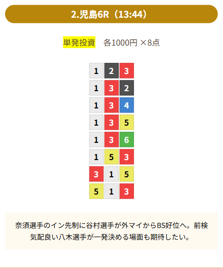 | 買い目 | 8点(3連単) |