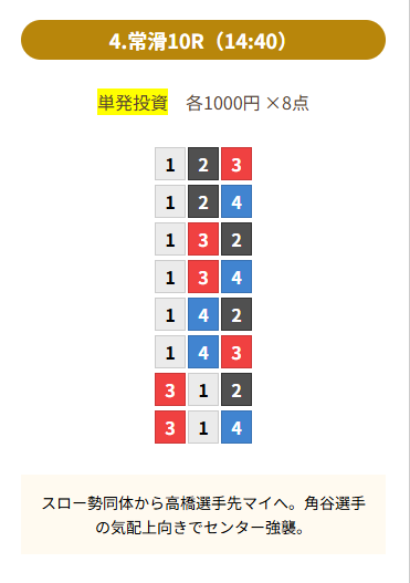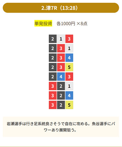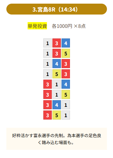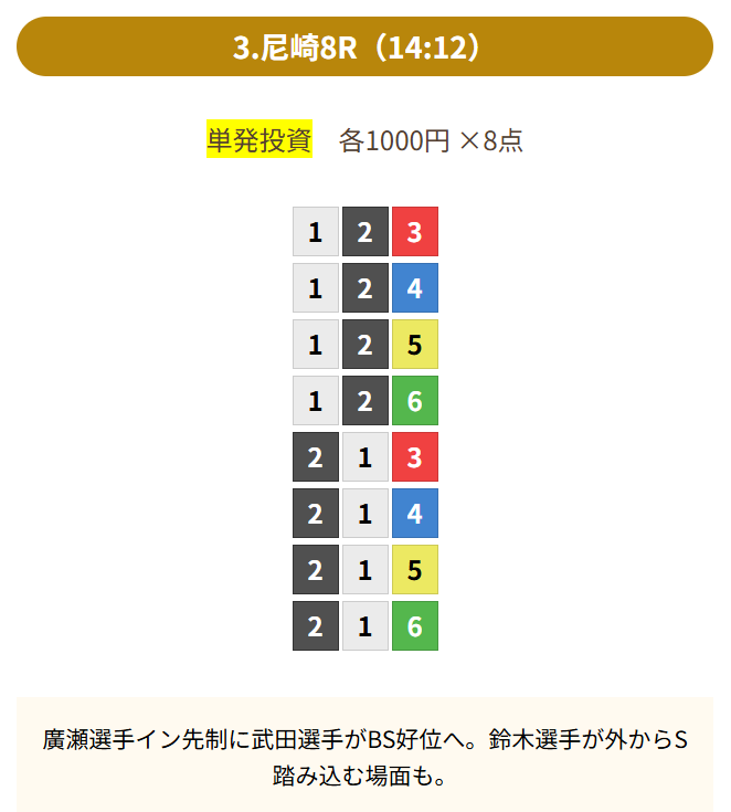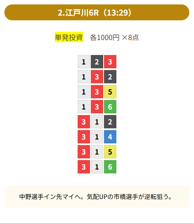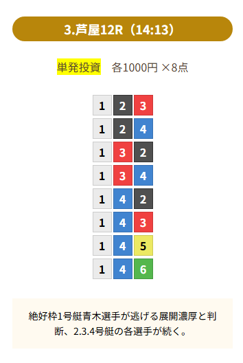 | 登録時にもらったポイントで初回の有料情報に参加。尼崎9R【1-6-2】、23.8倍で3連単を1点あたり1,000円ずつ賭けて23,800円を回収できました。 持ち出し0円でこの結果は素直に嬉しいです。予想もロジカルで納得感があり、次のプランにも期待しています。 | |