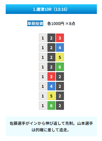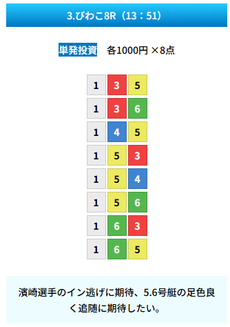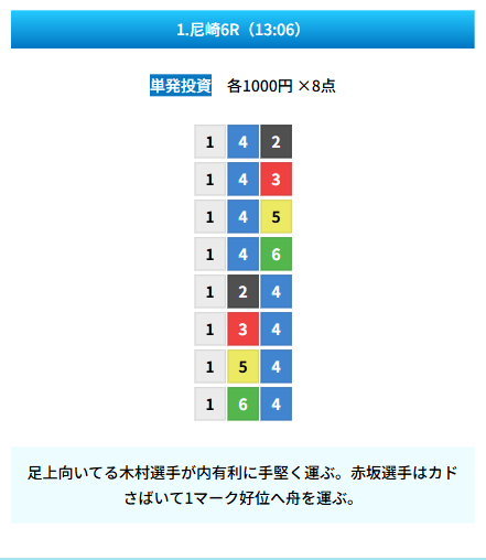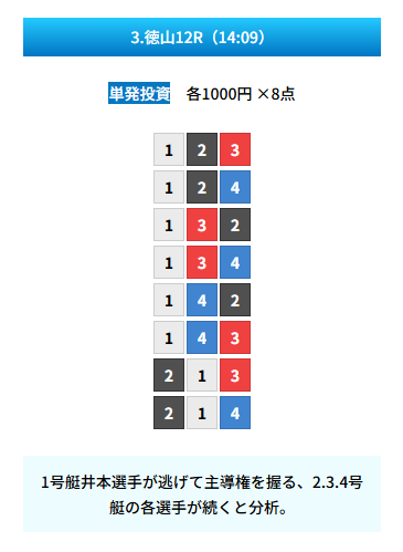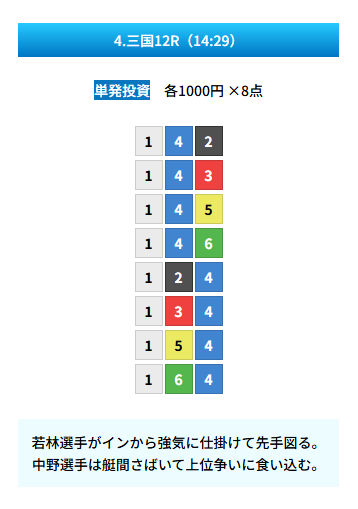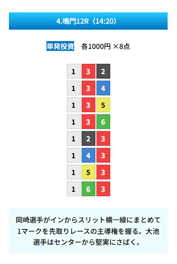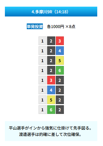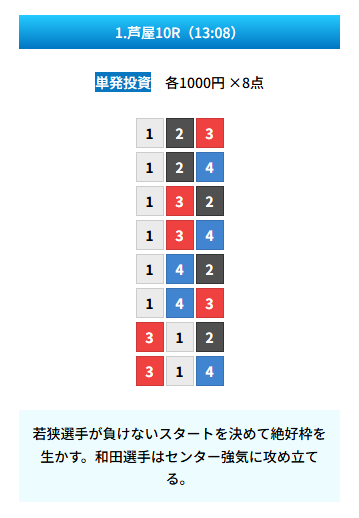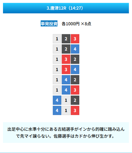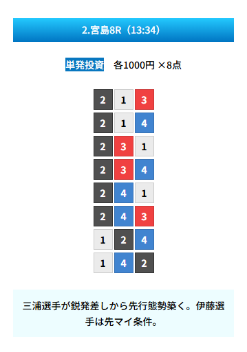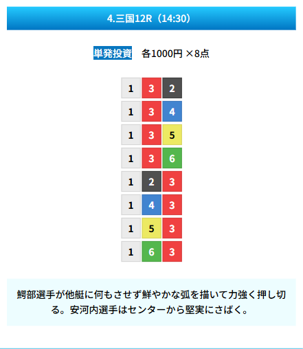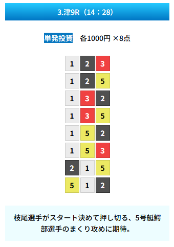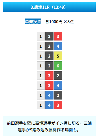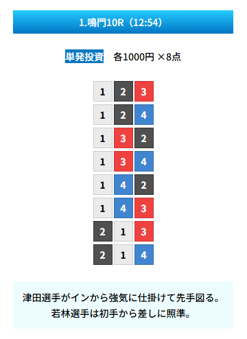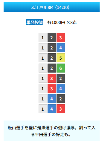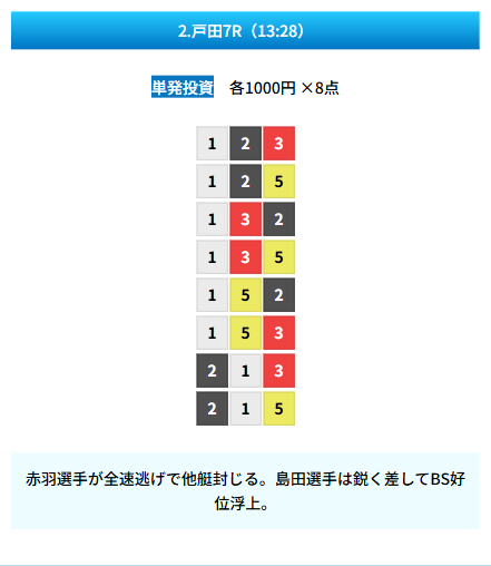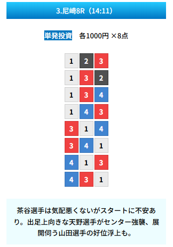 | 買い目 | 8点(3連単) |
