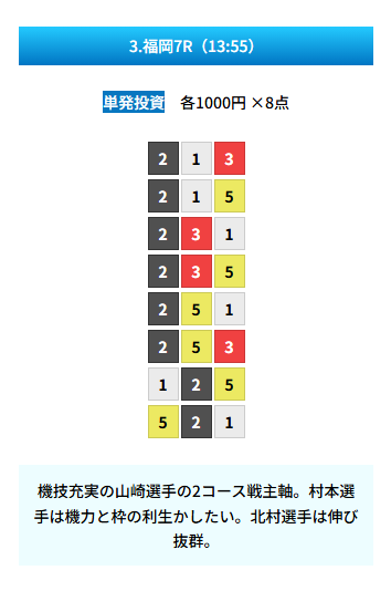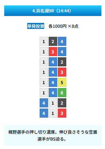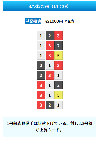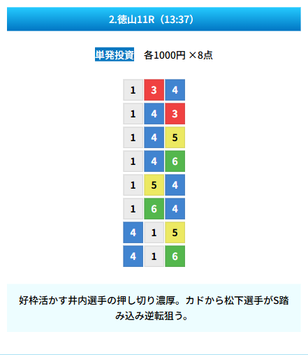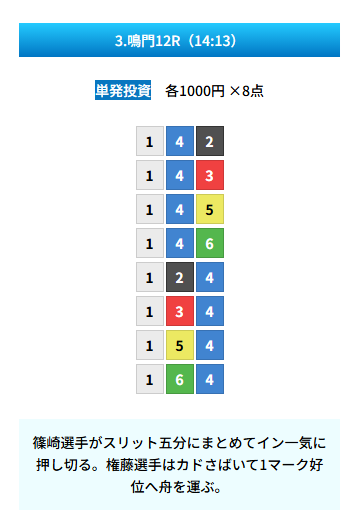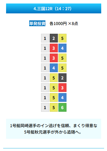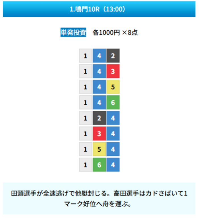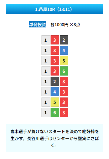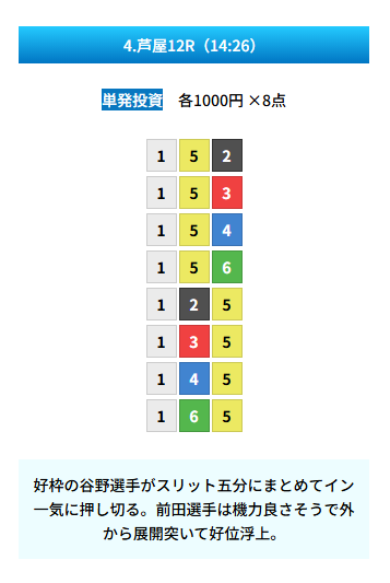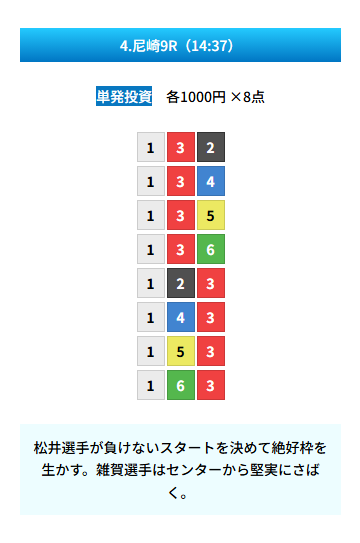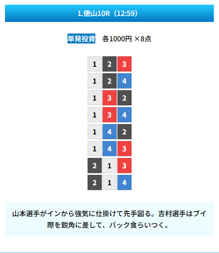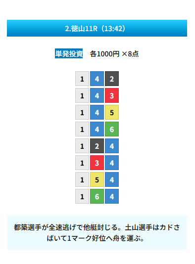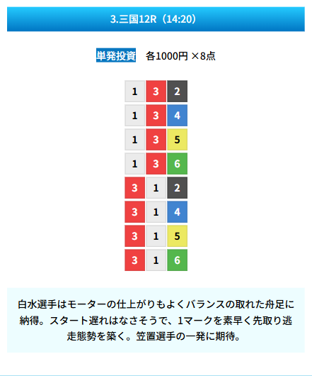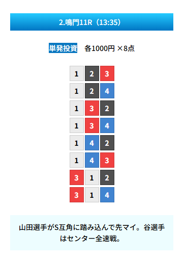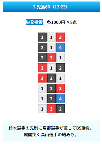 | 買い目 | 8点(3連単) |