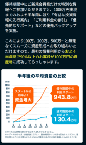 期間を設けて行われている「優待期間での登録」では1000万円の資産獲得を実現するための半年間に渡る様々なサポートを実施しています。