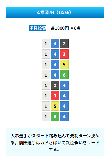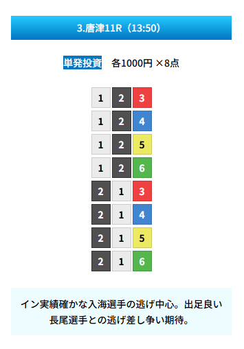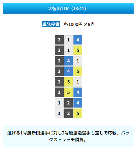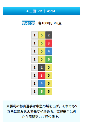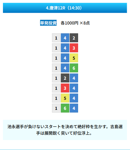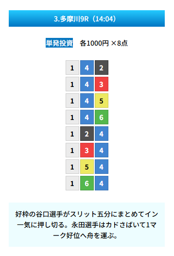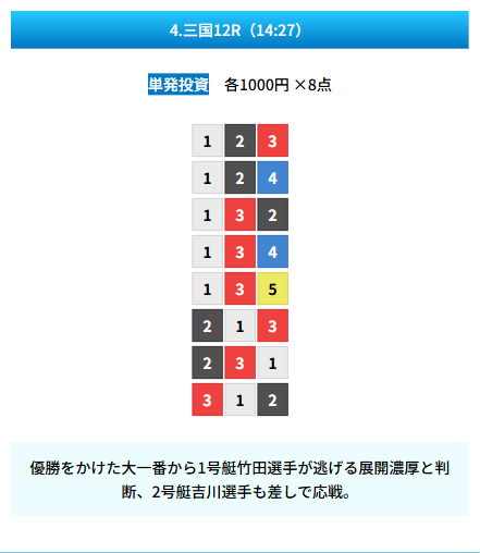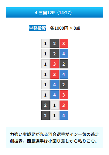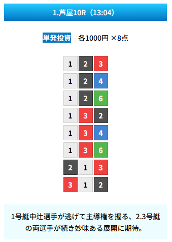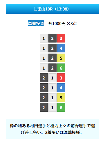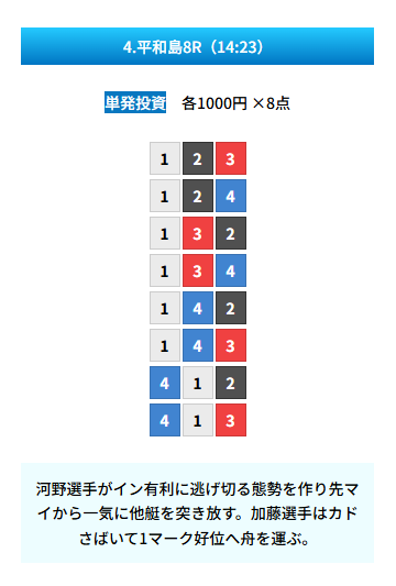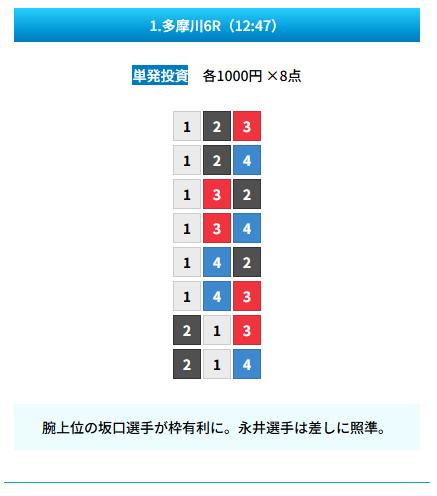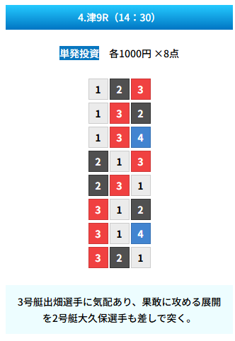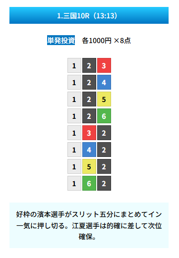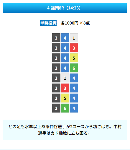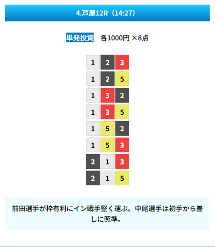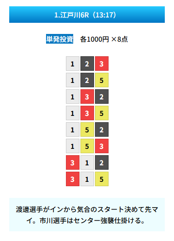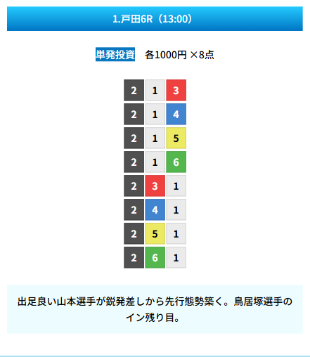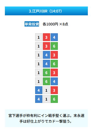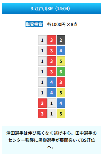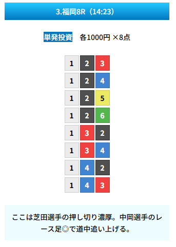 | 買い目 | 8点(3連単) |
