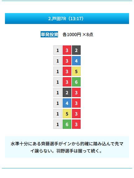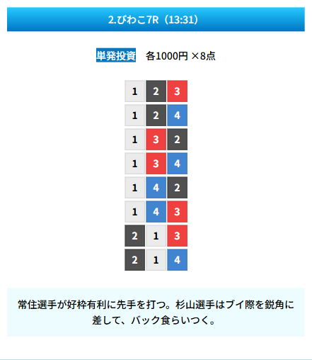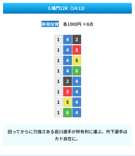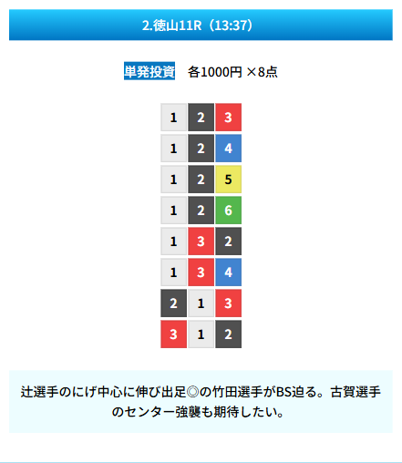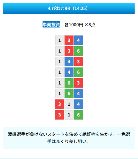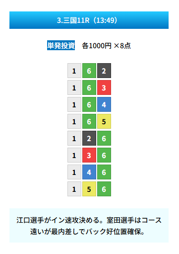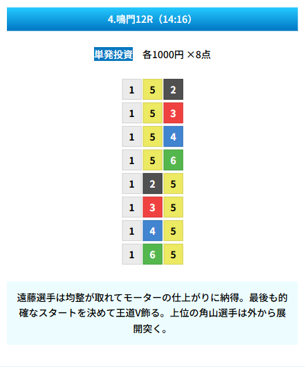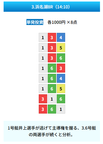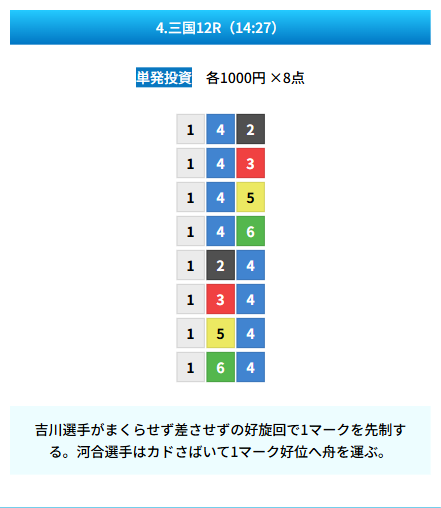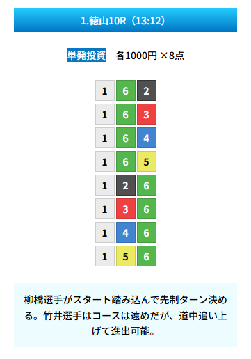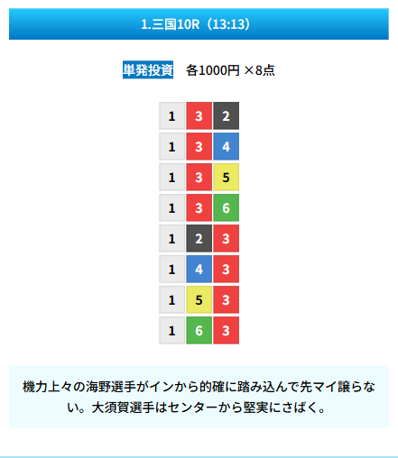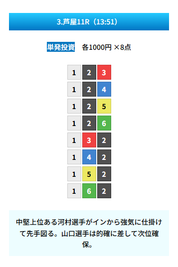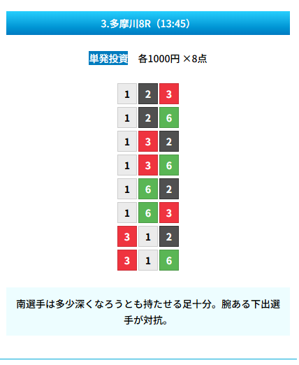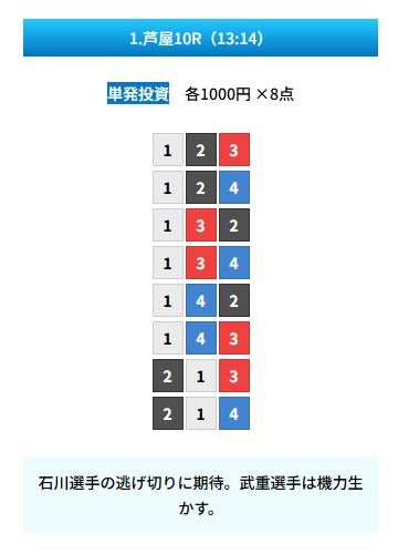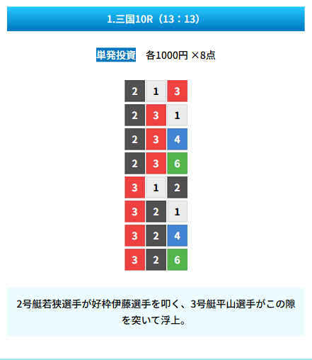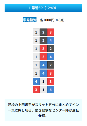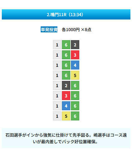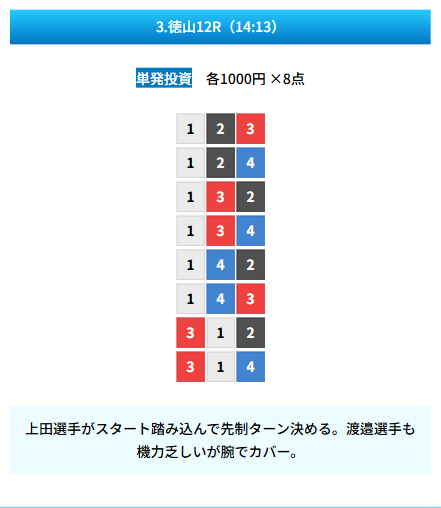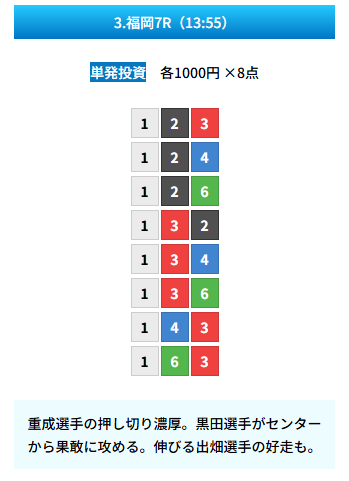 | 買い目 | 8点(3連単) |