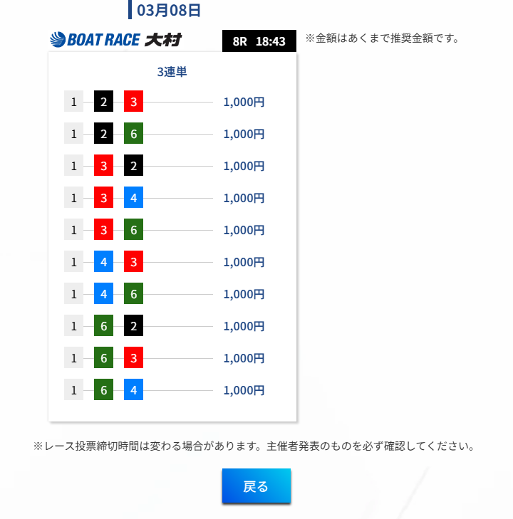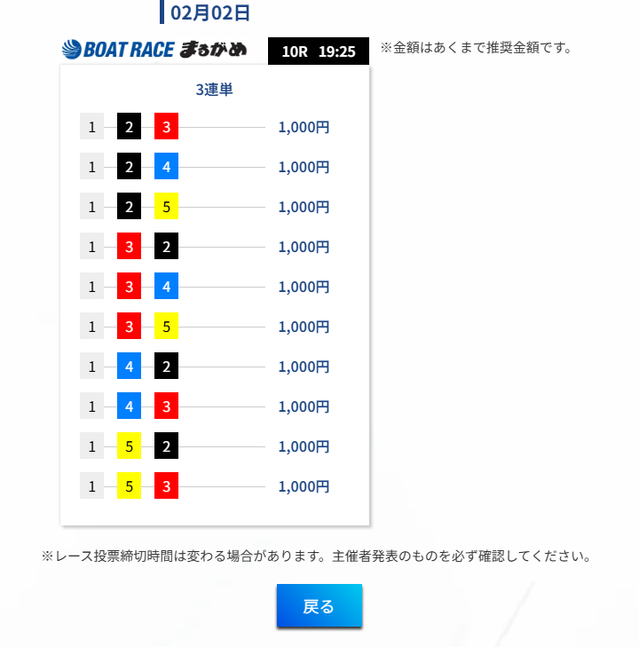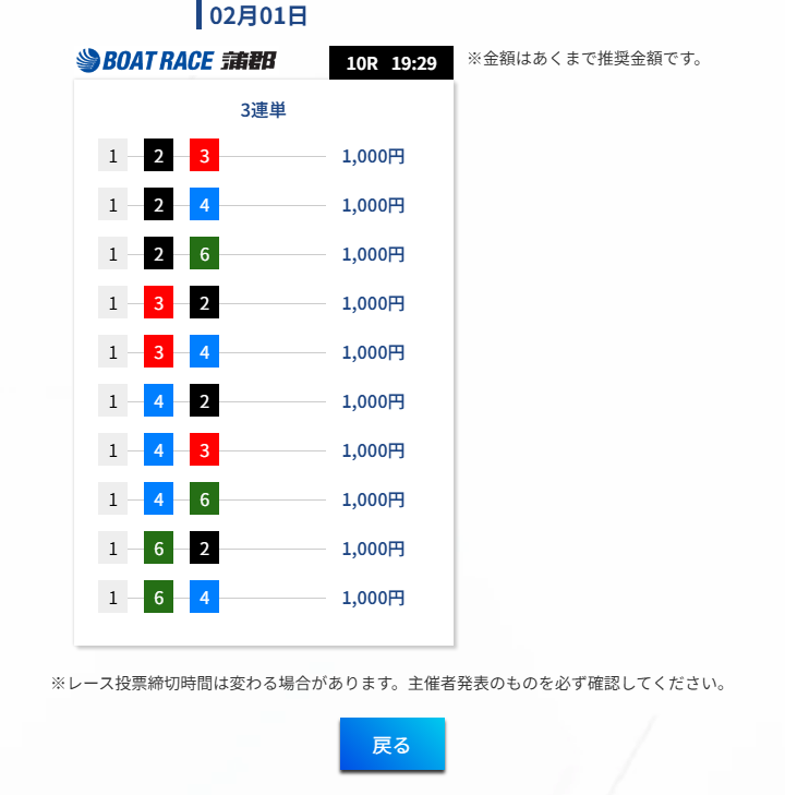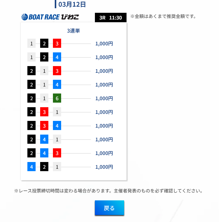 この手の競艇予想サイトに弱い少しの乱れが生じると不的中となってしまう部分の弱さが見えた瞬間であった。