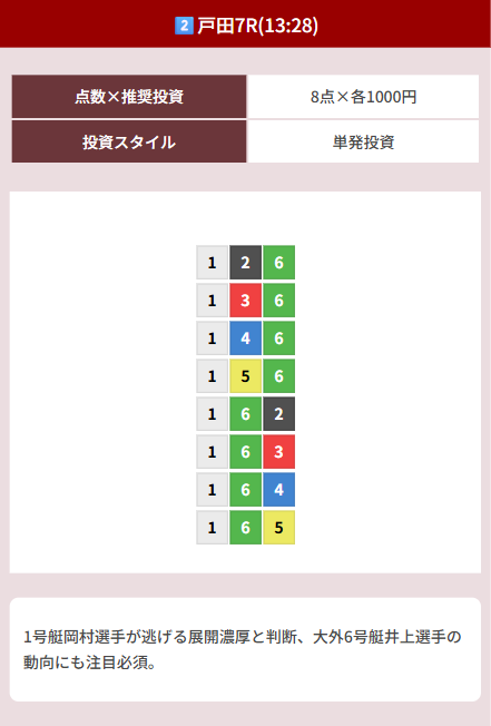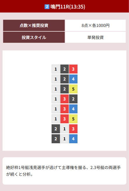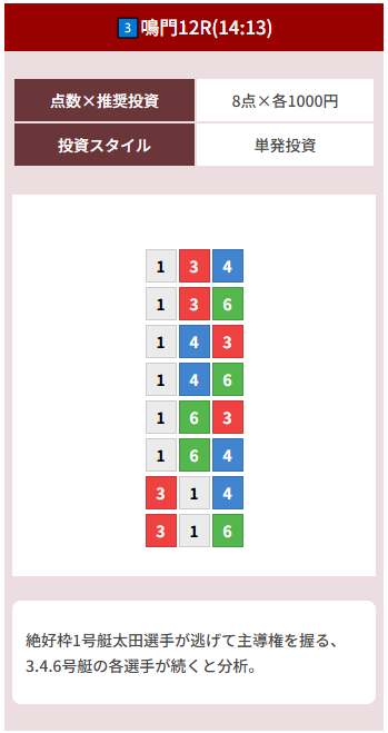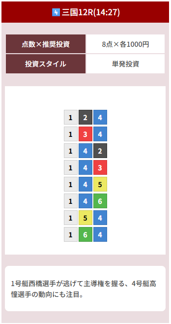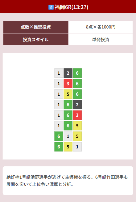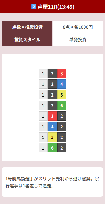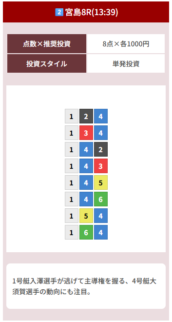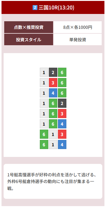 今回のレースは、スタート前から1号艇の優勢が予想される一方で、2号艇の位置取りやコンディションがカギとなる展開でした。MUGENは、イン逃げを基本としつつも、差しや展開次第で浮上する2号艇をしっかりと押さえる予想を提示。その結果、堅実な1号艇軸の舟券を手にしながら、オッズ妙味のある2号艇絡みの買い目も待つことが出来ます。