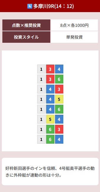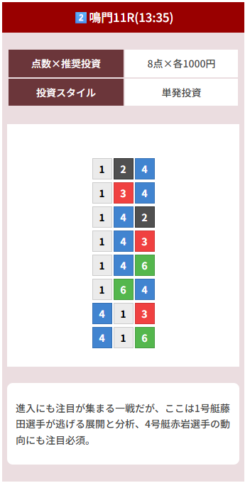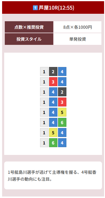 | 「1日2回の無料予想が特に便利! 的中率も高く、通勤中にチェックするだけで舟券購入がスムーズになりました。」 | |