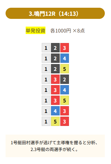 準優勝戦の1号艇に選出された人気レーサーの佐藤の逃げ切りと2号艇の柏野の差しを想定された買い目です。