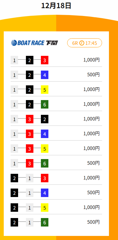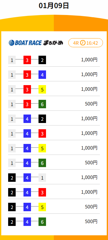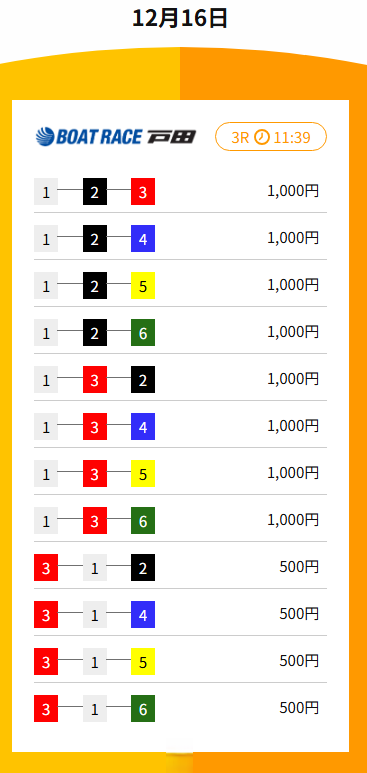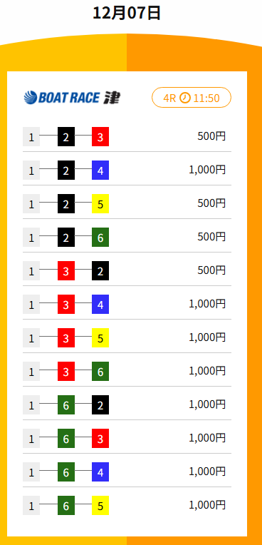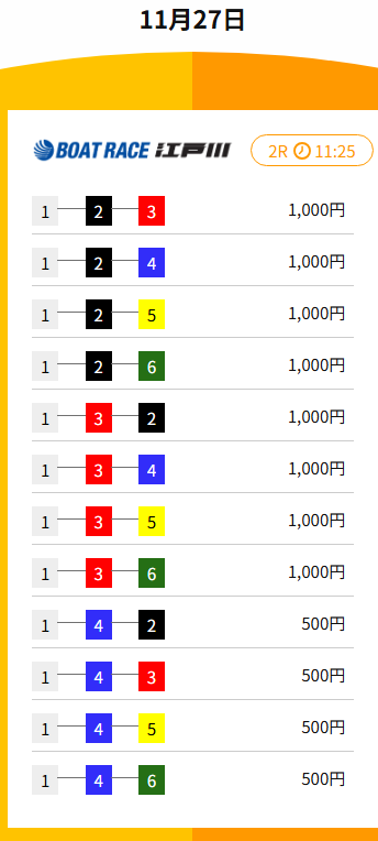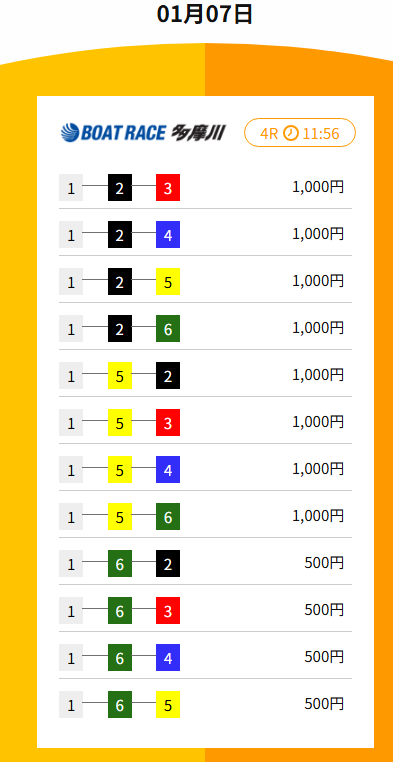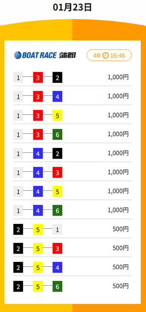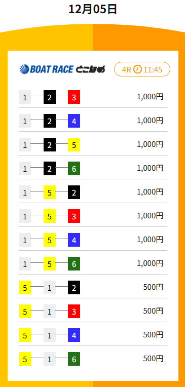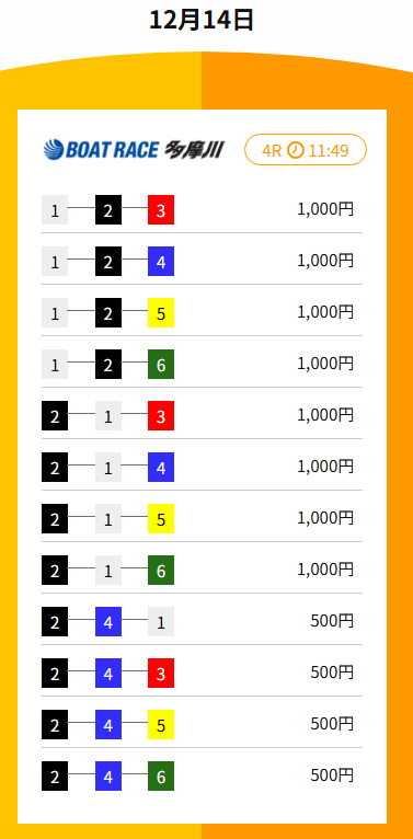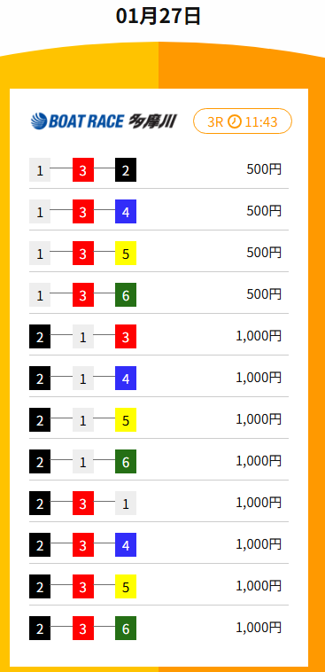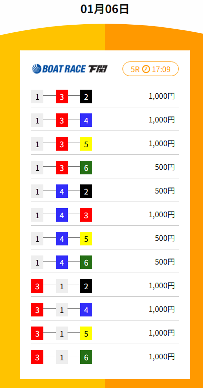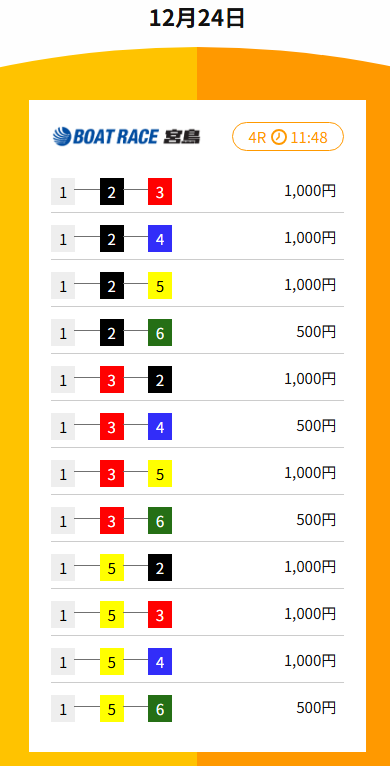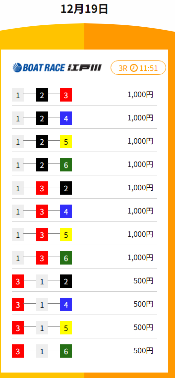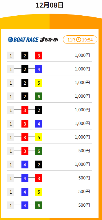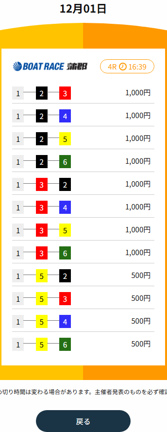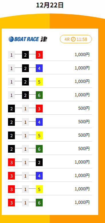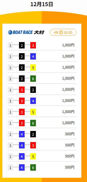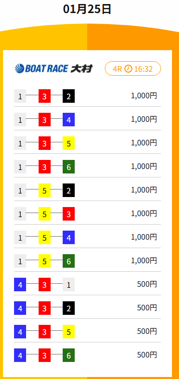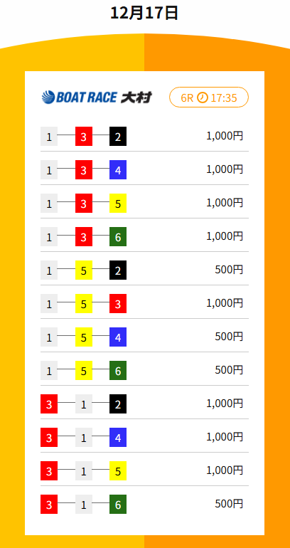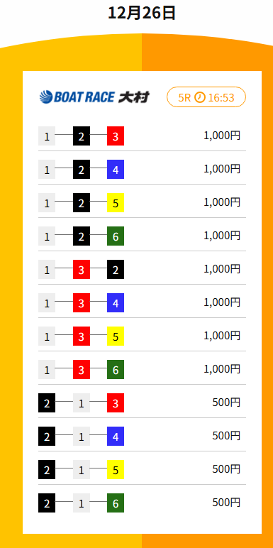 - 大村 11R:1-3-2(6.9倍)× 105,400円