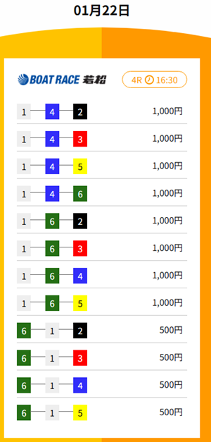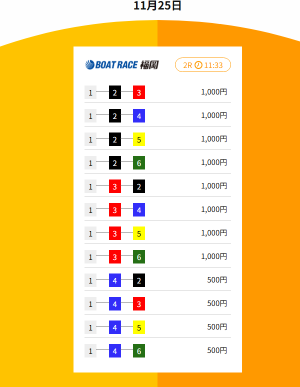 - 福岡 9R:1-3-5(33.0倍)× 3,000円