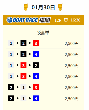 | 金 | 2026/1/30 | 福岡12R | 134 12.9倍 | 161%