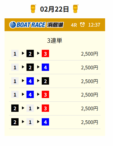 | 日 | 2026/2/22 | 浜名湖4R | 123 4.6倍 | 76%