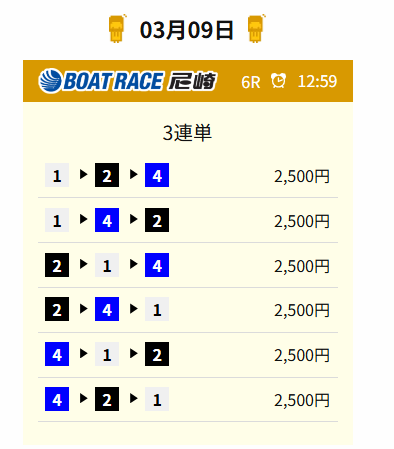 | 月 | 2026/3/9 | 尼崎6R | 124 4.7倍 | 78%