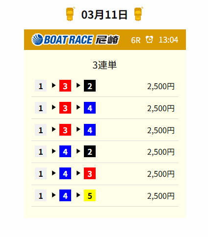 | 水 | 2026/3/11 | 尼崎6R | 134 7.9倍 | 131%