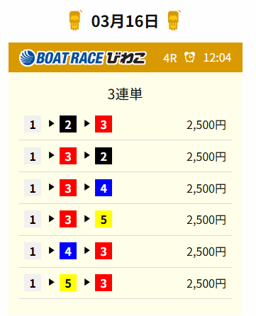 | 月 | 2026/3/16 | びわこ4R | 143 13.1倍 | 218%