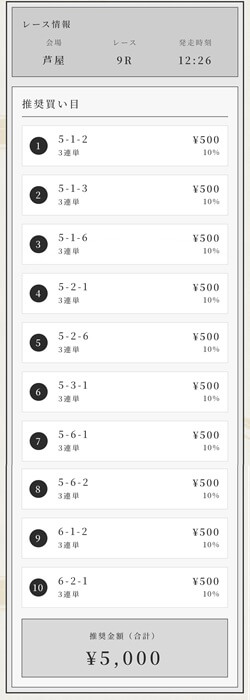 | 金 | 2026/3/13 | 芦屋9R | 256 136.7倍 | 不的中 |